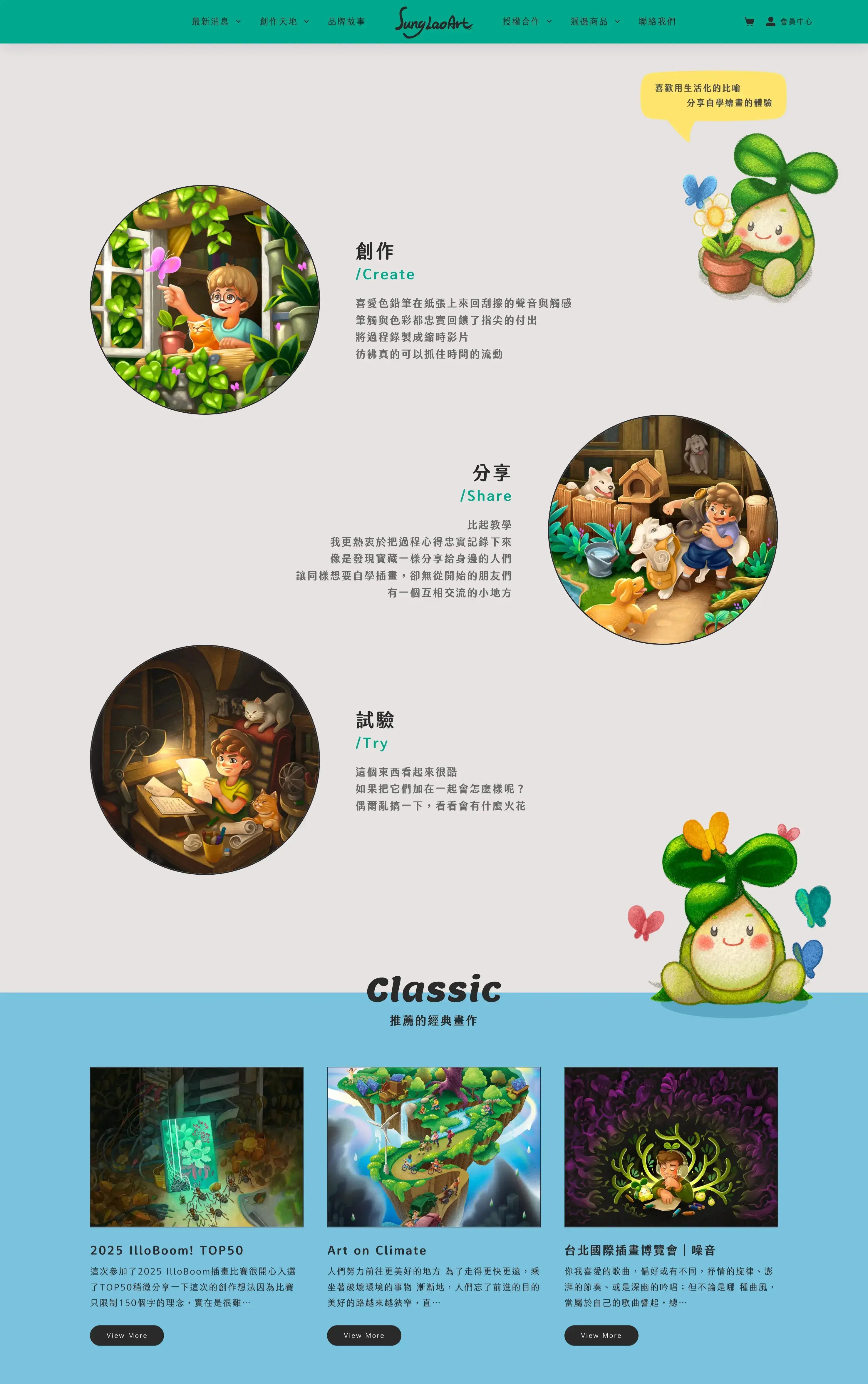 SungLaoArt 宋佬插畫家 Overview 設計概念以「溫柔的陪伴感」與「進入繪本」為核心,結合插畫家宋佬的創作語言,選用低飽和的自然色系與留白,讓插畫作品本身成為視覺主角。整體介面以簡單活潑為主,並融入了手繪的細節感,像是圓潤的標題字體、段落邊距的呼吸感,還有滑動時的細微動畫,這些都呼應了品牌傳遞「溫暖細膩」的療癒調性。網站結構以使用者旅程為主,從認識插畫家、瀏覽作品、到最終購買,流暢自然地串聯成一段故事。 website| https://sunglaoart.tw/